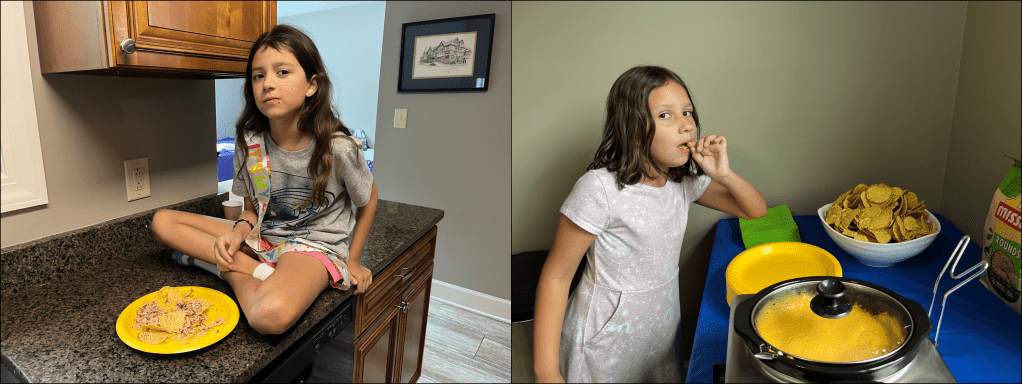 On the Friday before her birthday, Elaina wore a crown and a sash to school, as well as brought cupcakes for her classmates, leaving no doubt who the birthday girl was. That evening, we started decorating the house with planets, astronauts, and spaceships, while the girls stuffed the piñata with candy (and of course saving a few for themselves). Gabriella and I also made the carnitas, which would cook all night before I chopped it up in the morning. As per our standard birthday party fare, carnitas nachos were once again chosen by Elaina as the main dish for her event.