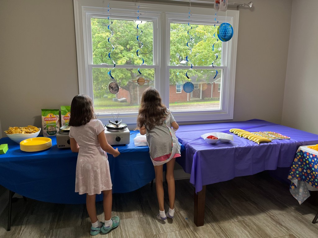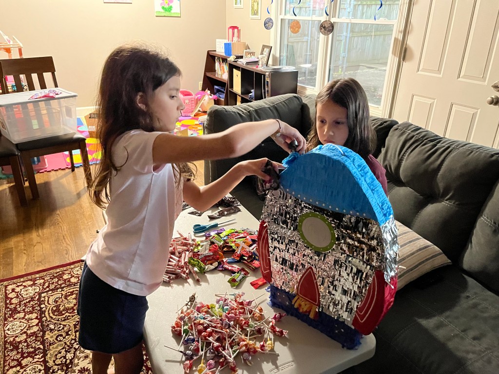 They helped me finalize the birthday table and did some last-minute cleaning around the house. Because of her unique theme, we got these cute NASA bags for everyone, which included various space-themed favors, such as galaxy stress and bouncy balls, “space” slime, a die-cast space shuttle, and planetary dig kits (like the dinosaur eggs, but with space).
