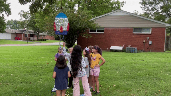 Afterwards, we went outside for the piñata, which one of the parents helped hoist up over the tree in our front yard. It had stopped raining, so it was a great time to knock this activity out before it returned (which it did). Even though there was no slugging with a bat this year (I feel that they are making these things tougher specifically so they cannot be destroyed anymore, because of safety or something), the girls had a lot of fun pulling strings and picking up candy regardless.
