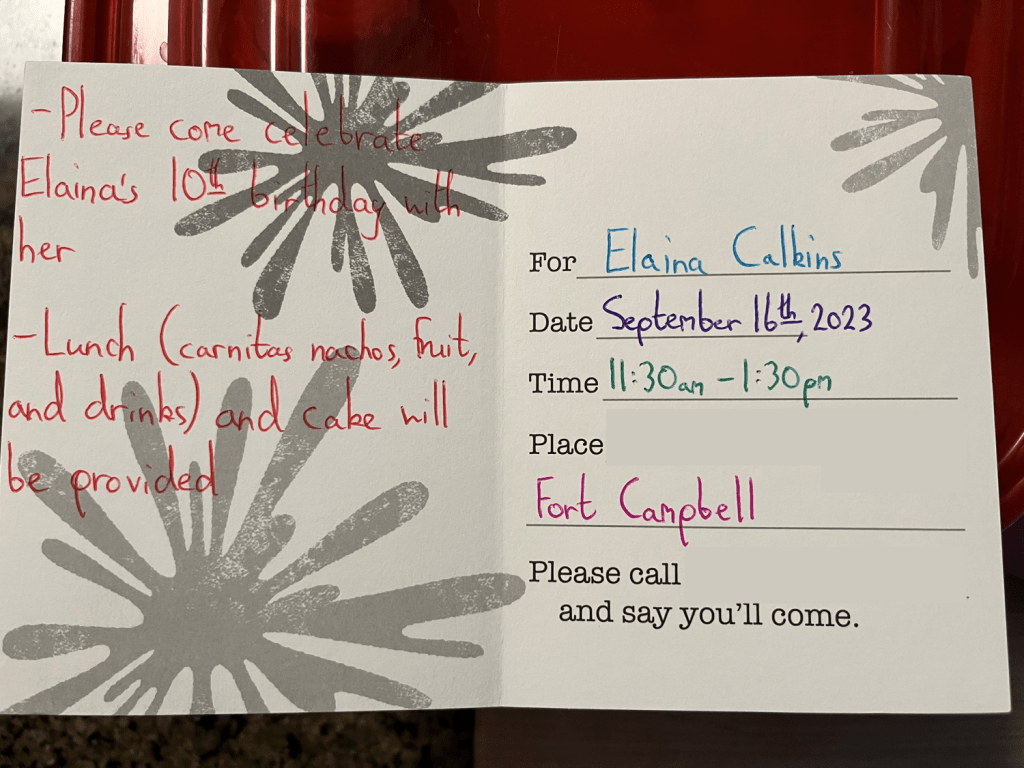 When I dropped Elaina off at her friend’s party, a strange thing happened that I was not prepared for: parents were just dropping their kids off. I did not want to be seen as a helicopter parent or untrusting of the hosts, so I eventually gave Elaina a hug and said I would be back in two hours (Gabriella saw this as an opportunity for some Daddy-Daughter time). I could not tell if this was a Fort Campbell thing or if it was just how parties are when kids get older, but it was certainly different than our full family gatherings at Fort Huachuca. Elaina and I were curious to how it was going to be when it came to her party.