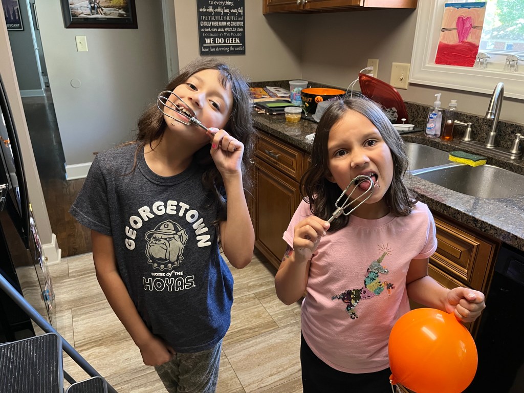 In between cleaning, the girls kept bugging me about if the frosting was ready. Eventually, all the food coloring had been added and the girls finally got their promised beaters of frosting. (It probably should be noted that, given the amount of sugar they ingested, the girls brushed their teeth several times throughout the day instead of just their usual two).
