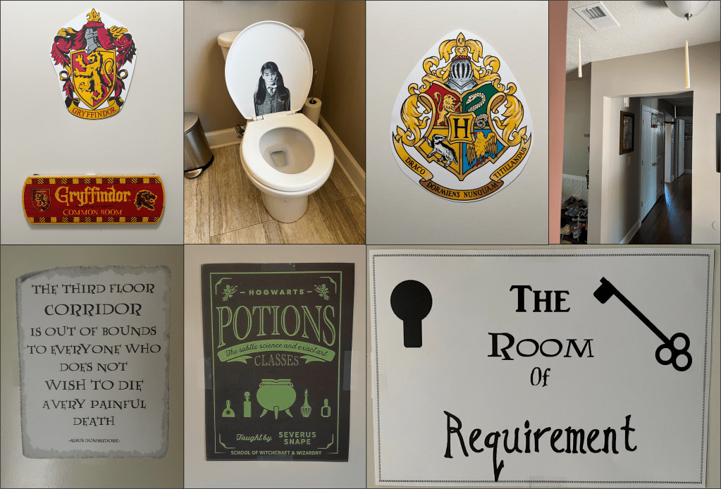 Decorating the house was another fun task the girls and I all took part in. Aside from having house crests all over the place, I labelled my “off-limits” room with Dumbledore’s warning from the first book, while “casting a spell” for floating candles right below the ceiling.