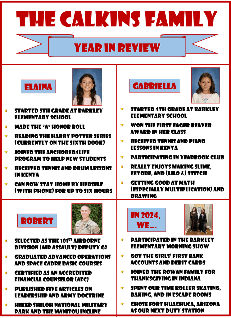 Even though we are apart for the holidays, the girls were excited to spend time with their mom’s side of the family (The Familia) and it gave me a little time to recharge before our vacation in January and my last field exercise at Fort Campbell in February. Absolutely cannot wait for them to get back though, as well as to spend the holiday season with them next year.