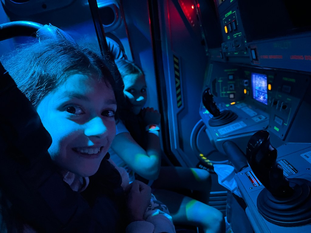 We then headed over to Mission: SPACE, which the girls had never been on but had a short wait time. The girls were a little skeptical about going on it though, as they have heard stories about this attraction for years. The ride has two missions, green and orange; the green mission goes around the Earth and is less intense, while the orange mission goes to Mars and is intense. Following our deployment to Afghanistan in 2011, their Mother and I thought we were pretty tough and there was no question we were going to own the orange mission. Up to 2.5 G forces later, we both felt sick and not too tough. So the girls and I opted for the green mission this time, with Elaina playing the role of the pilot, Gabriella the navigator, and I the commander; apparently, we did not really need an engineer. While there was a little intensity, they both managed fine, enjoying their trip around the planet.